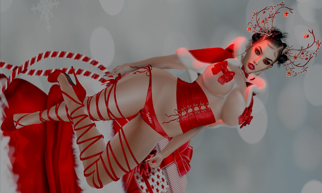 Santa's Xmas Outfit from Le'La, this only comes in the one colour but you get so much with it. You get the antlers (has a resize script in them), earrings, pasties (bows), cape, corset, laced up heels, knickers and collar. I find that all Le'La clothing fit my bodies really well.